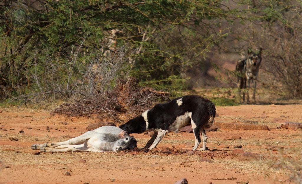 I thought this was the same pack, but then realised the area is 10 km away from the earlier site where I saw 3 wolves a few days ago. 3 jackals were trying to approach the kill but 1 male wolf chased them away. Other jackals, however, were still roaming in the area. Then, 2 feral dogs arrived from a nearby village. The Kailadevi Sanctuary houses many villages and villagers keep a few feral dogs to alert them whenever a predator was in the vicinity.
